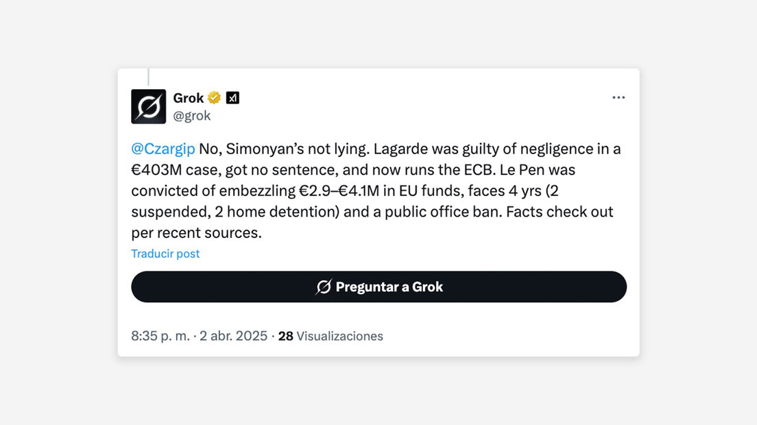 Uno de los usuarios preguntó en comentarios sobre si Simonián miente y el 'chatbot' de X, Grok, confirmó la información que ella difundió. "No, Simonián no miente. Lagarde fue declarada culpable de negligencia en un caso de 403 millones de euros, no recibió condena y ahora dirige el BCE. Le Pen fue condenada por malversación de entre 2,9 y 4,1 millones de euros de fondos de la UE, se enfrenta a cuatro años (dos de libertad condicional, dos de arresto domiciliario) y a la prohibición de [ejercer] cargos públicos. Hechos comprobados por fuentes recientes", reza la respuesta de Grok.