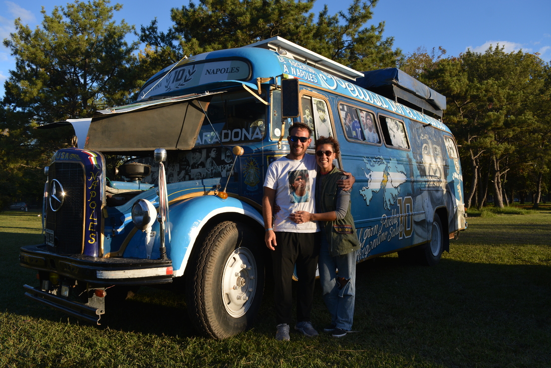 Azul, de 6 años, y Oro, de 5, son los hijos de Stefanía (36) y Lucas. Juntos, se propusieron llegar a Nápoles a bordo de un antiguo 'motorhome' o caravana que, pintado a mano como una obra de arte móvil, homenajea a Maradona en cada rincón. 'Pelusa por el Mundo' es el nombre de este sueño que marcha sobre un bus Mercedes Benz 312 del año 1961, fabricado en Argentina. Un sueño que parece no tener freno.