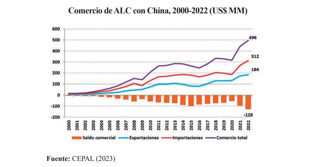 Además, exceptuando de Brasil, Chile y Perú, la región latinoamericana presenta un duradero déficit comercial con el país asiático. Llama la atención el caso de México, con un saldo negativo de 827.000 millones de dólares en el periodo 2011-2022. En ese periodo, el déficit comercial acumulado por el conjunto de la región fue de 1.280 billones de dólares, dos tercios de los cuales corresponden a México.