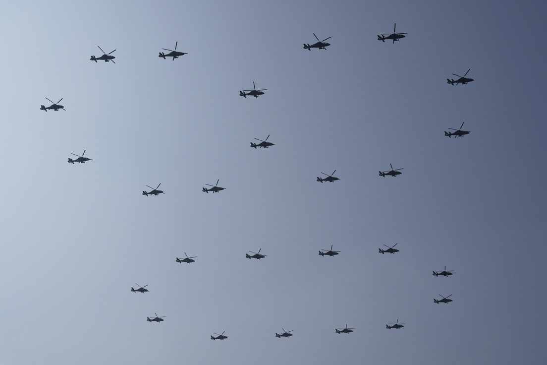 Durante el desfile, una escuadra aérea china sobrevoló la plaza de Tiananmén, en Pekín, ondeando las banderas del gigante asiático, del Partido Comunista y del Ejército Popular de Liberación. Le siguió otra formación, compuesta por 26 helicópteros, que representó las cifras del 80.º aniversario de la victoria.