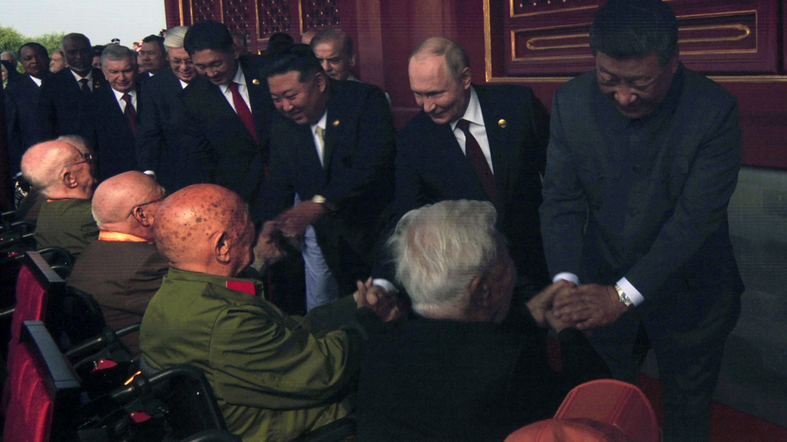Antes del inicio del evento, Xi Jinping, Vladímir Putin, Kim Jong-un y otros líderes estrecharon la mano de los veteranos que participaron en los combates.