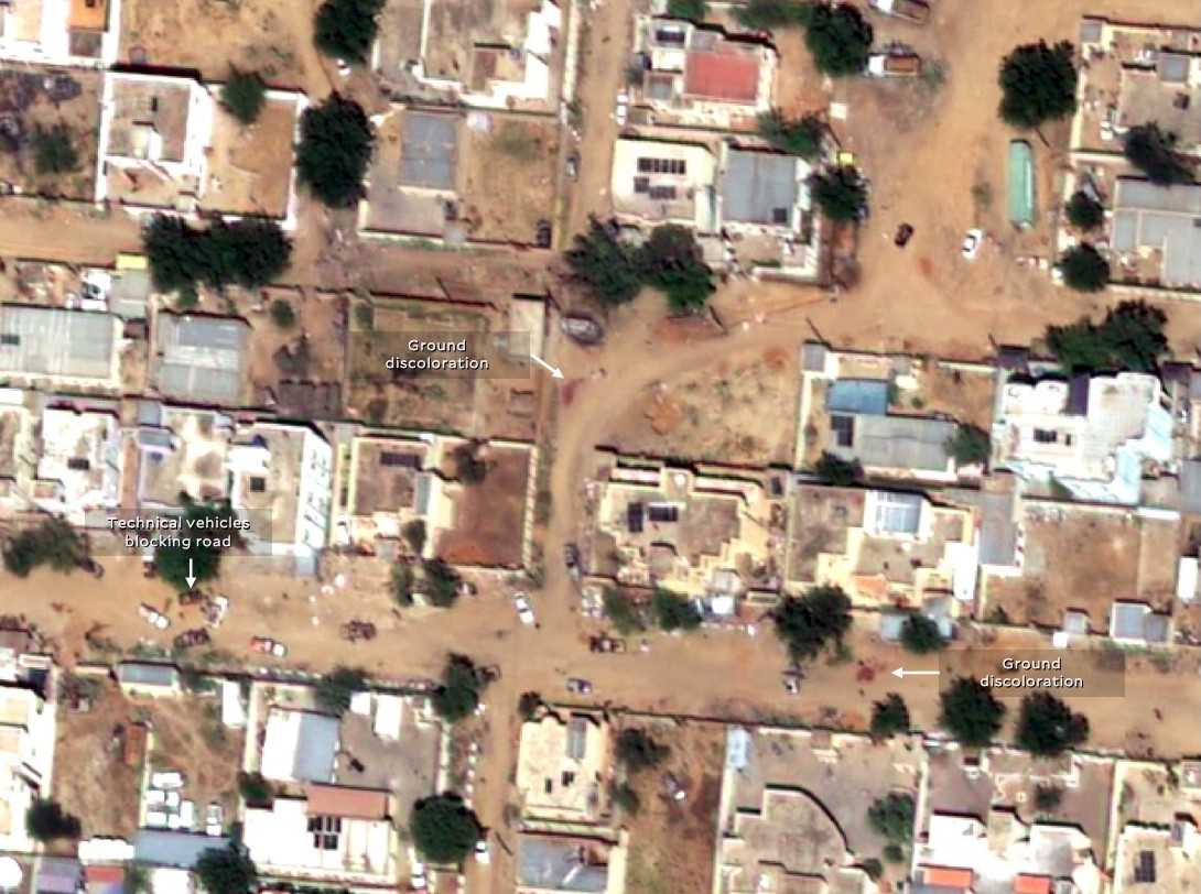 Los expertos del Laboratorio de Investigación Humanitaria, que monitoreaban el asedio de El Fasher mediante imágenes satelitales y fuentes abiertas, descubrieron posteriormente grupos de objetos "compatibles con el tamaño de cuerpos humanos sobre el suelo cerca de vehículos de las RSF", así como una "coloración rojiza del terreno", que podría ser sangre o tierra removida.