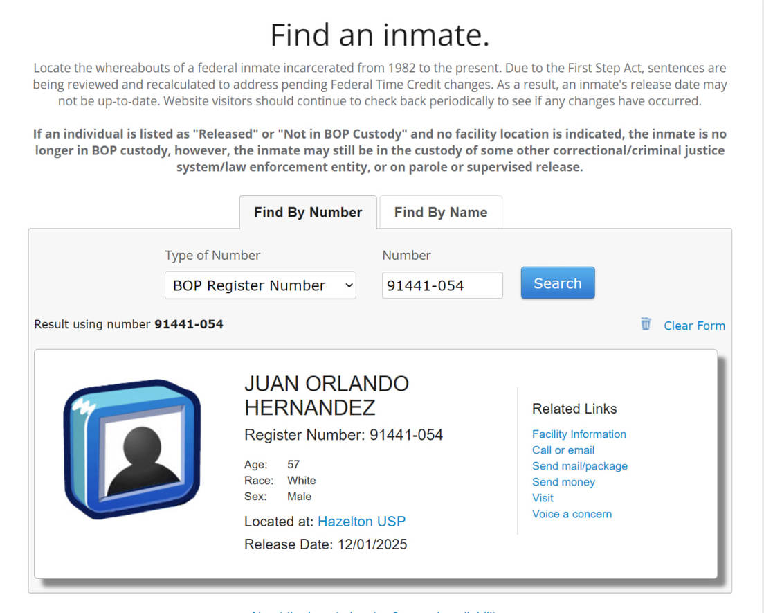 El Buró Federal de Prisiones de EE.UU. (BOP, por sus siglas en inglés) actualizó este martes su página oficial en la que consta que el expresidente de Honduras Juan Orlando Hernández, con registro 91441‑054, figura ahora con fecha de liberación para el 1 de diciembre de 2025.