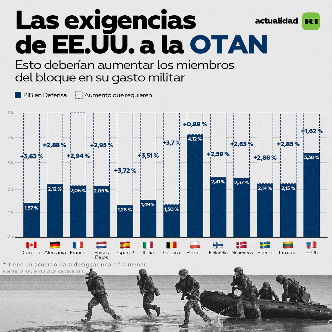 - En junio del 2025, los 32 países de la OTAN acordaron aumentar el gasto en defensa hasta el 5 % del PIB, de los cuales el 3,5 % se destinará directamente a defensa y el 1,5 % a gastos adicionales relacionados.