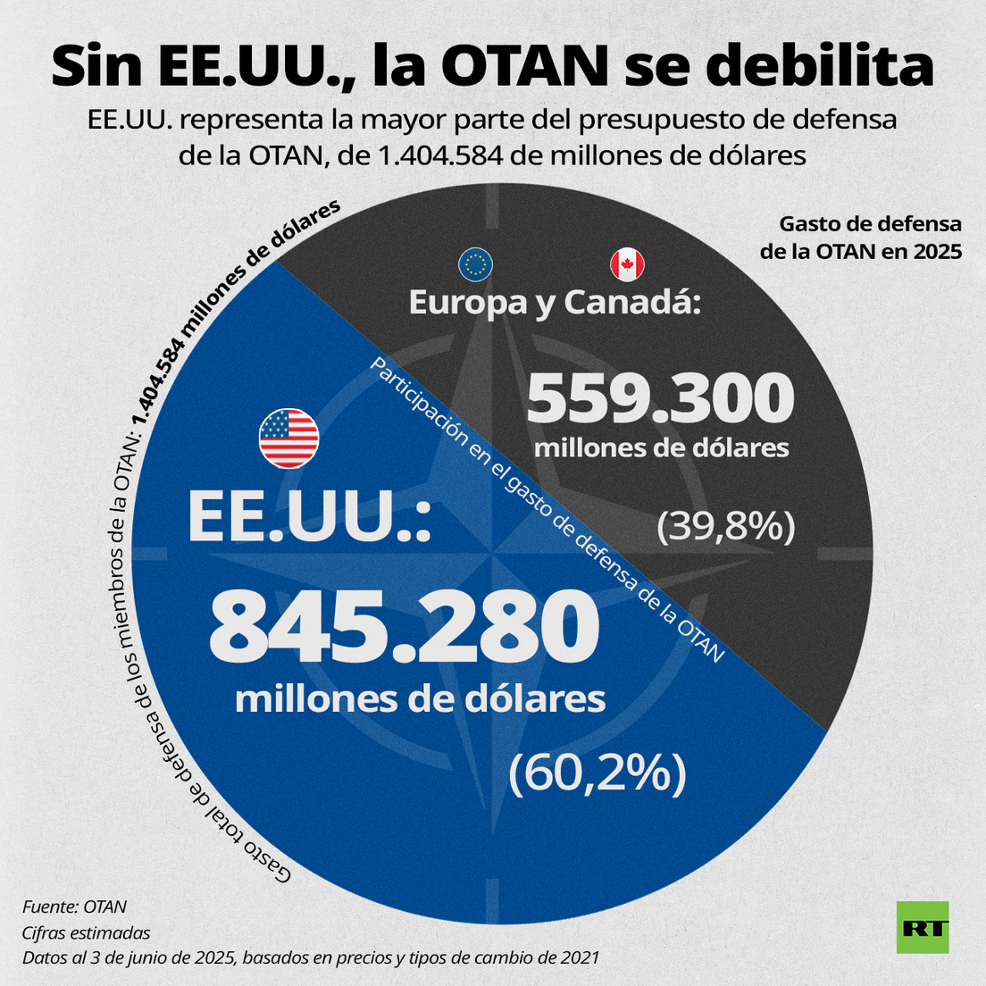 Estados Unidos fue el mayor contribuyente individual, con un gasto estimado de 845.280 millones, lo que representa el 60,2 % del presupuesto total. Mientras, los miembros europeos del bloque militar y Canadá habrían aportado conjuntamente 559.300 millones, el 39,8 %.