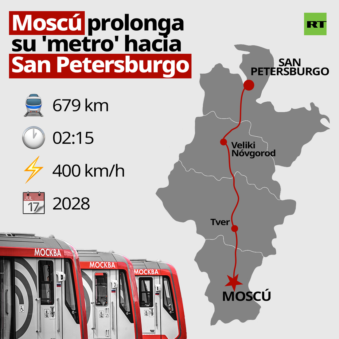 La VSM entre Moscú y San Petersburgo fue incluida en agosto del año pasado en el plan de desarrollo del metro de la capital rusa para el período 2026-2030 "para la creación de una infraestructura de transporte moderna, cómoda y accesible que garantice una comunicación rápida entre las regiones del país".