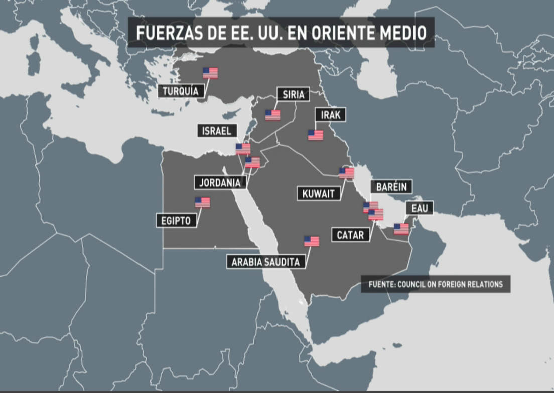 El Cuerpo de la Guardia Revolucionaria Islámica (CGRI) comunicó que misiles iraníes fueron lanzados contra cuatro bases militares estadounidenses: Al Udeid, en Catar; Ali Al Salem, en Kuwait; Al Dhafra, en Emiratos Árabes Unidos, y la base que alberga la Quinta Flota de la Armada de EE.UU. en Baréin.