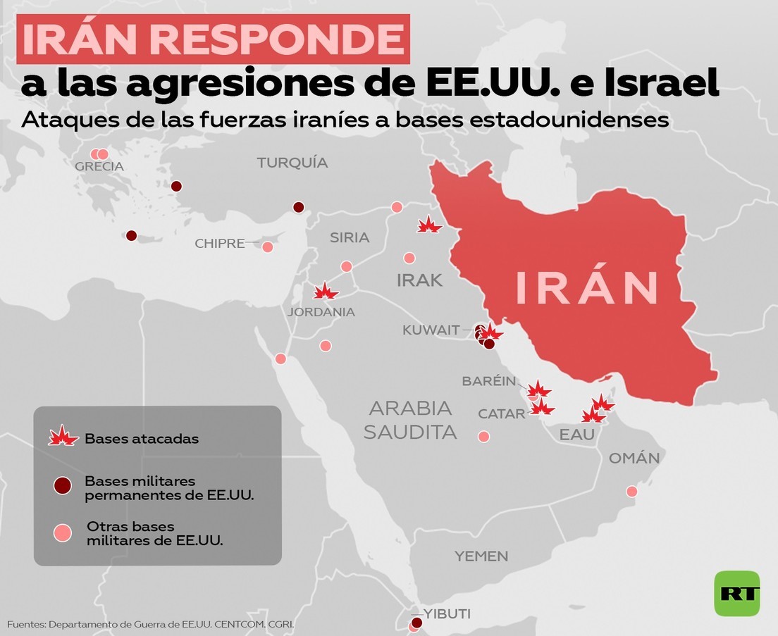 - En respuesta a la agresión contra su territorio, Irán lanzó ataques contra instalaciones estadounidenses en la región y ha alcanzado objetivos militares de EE.UU. prácticamente en todo Oriente Medio, incluidos Catar, Emiratos Árabes Unidos, Baréin, Kuwait, Arabia Saudita e Irak.