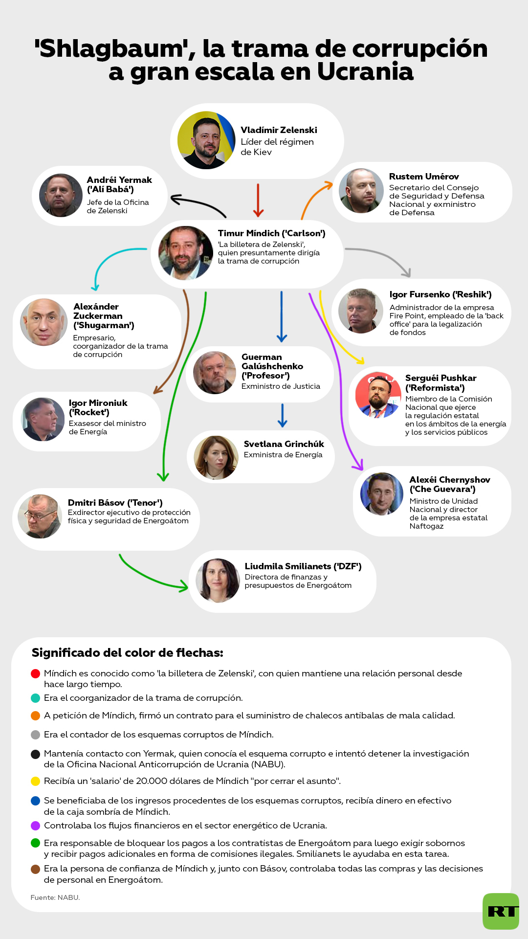 Los auditores citaron el escándalo revelado en noviembre del año pasado por la Oficina Nacional Anticorrupción de Ucrania (NABU) y la Fiscalía Especializada Anticorrupción (SAP), relacionado con una trama de corrupción a gran escala en el sector energético que "resultó en el arresto del ex viceprimer ministro de Ucrania y en las dimisiones del ministro de Energía, el ministro de Justicia y del jefe de la Oficina Presidencial" de Zelenski.
