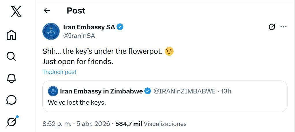 Así, la sede diplomática iraní en Zimbabue ironizó: "Hemos perdido las llaves", mientras que la misión en Sudáfrica respondió en tono burlón: "Shh… la llave está debajo de la maceta. Solo está abierto para los amigos".