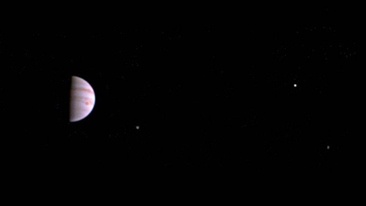Según afirma la NASA, la imagen fue tomada el 10 de julio, cuando la sonda se encontraba a una distancia de 4,3 millones de kilómetros de Júpiter. En la fotografía a color se aprecian formaciones atmosféricas del planeta lejano, incluso la Gran Mancha Roja, así como tres de sus cuatro mayores satélites: Ío, Europa y Ganímedes.