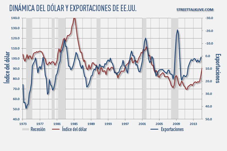 La siguiente infografía muestra la tendencia del dólar en comparación con la variación porcentual anual de las exportaciones sobre una base trimestral. La escala de las exportaciones ha sido invertida para mostrar más claramente la correlación, pudiéndose apreciar que en algunos casos cuando empieza a crecer el dólar, empiezan a caer las exportaciones.