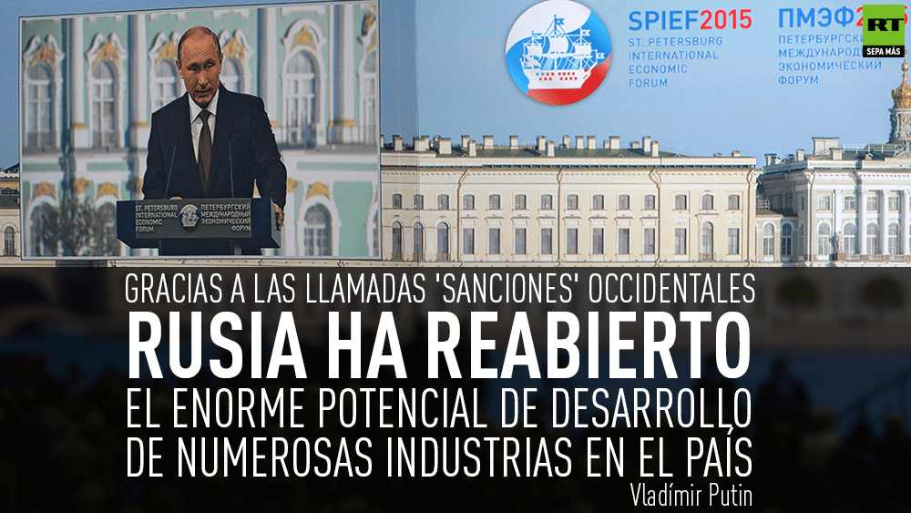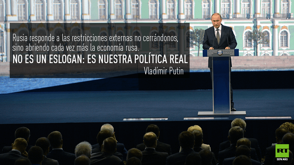 "No respondemos a las restricciones externas cerrando la economía, sino que respondemos por medio del aumento de la libertad, de la apertura de Rusia. No es un lema, es el contenido de nuestra política actual, de aquel trabajo que actualmente estamos realizando para la creación de condiciones para las empresas, para la búsqueda de nuevos socios, nuevos mercados, para la participación en la ejecución de los más grandes proyectos de integración", dijo Putin.