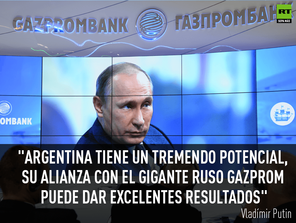 Hay un acuerdo concreto sobre el inicio de la cooperación entre empresas rusas y argentinas en el sector del petróleo y del gas, confirmó Putin. "De hecho, Argentina tiene un tremendo potencial y, por supuesto, su alianza con una de las compañías líderes en el mundo como es Gazprom, puede dar excelentes resultados", sostuvo Putin.