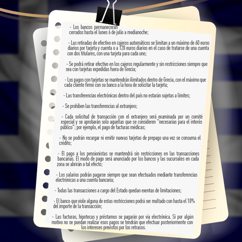 El decreto, publicado en la mañana del lunes, incluye, entre otras medidas extraordinarias, el cierre de los bancos griegos durante toda la semana, hasta el 6 de julio, y un límite de retirada de 60 euros diarios por cuenta para las personas físicas.