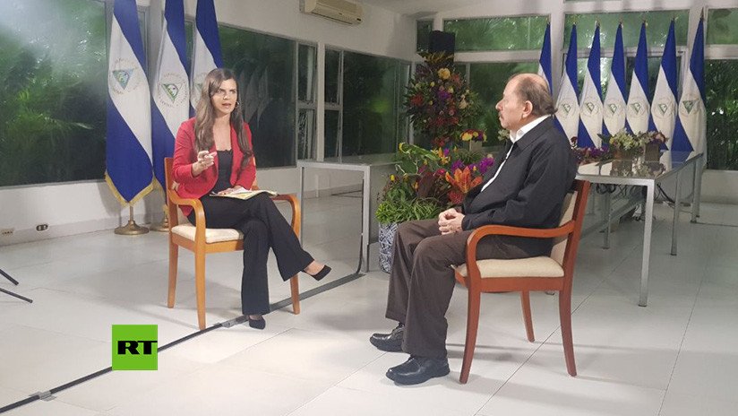Comentando las protestas que se desarrollan actualmente en el país, Ortega señala que la campaña se originó inicialmente a raíz de un "incendio de grandes proporciones" que se produjo en la costa sur. No obstante, aunque se pensaba que iba a durar meses, se apagó gracias a una lluvia. La protesta vino nuevamente cuando se presentó una ley relacionada con la seguridad social. Era una ley "indispensable", según él. "Todo el mundo sabía que era necesaria", señala. Al principio, era una protesta "normal", pero "la noche siguiente empiezan a salir agrupaciones armadas a atacar puestos de la Policía, atacar a alcaldías, atacar sedes del Frente Sandinista, es decir, viene toda una oleada de ataques armados que empieza a provocar muertos", relata Ortega.