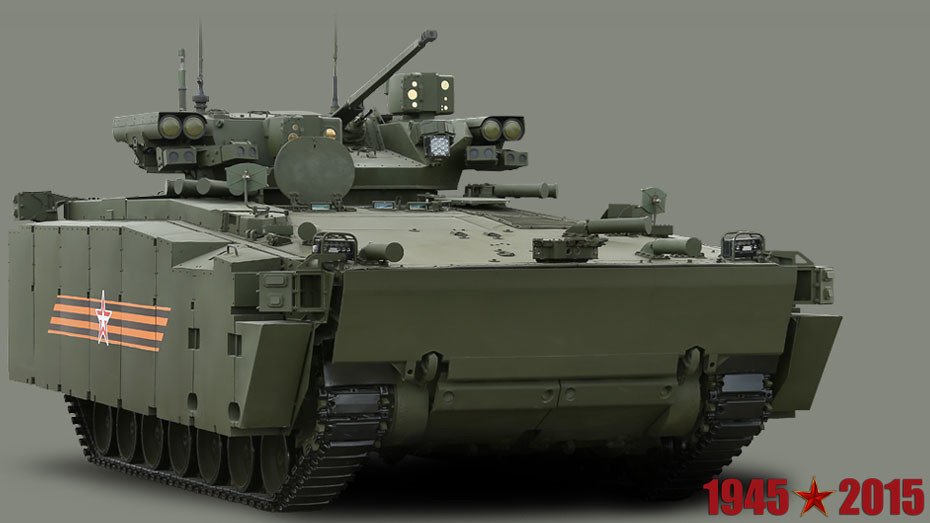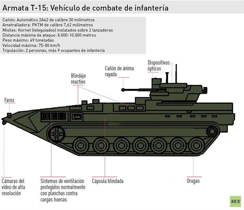 El vehículo de combate de infantería T-15 lleva misiles guiados antitanque y un potente misil antiaéreo, así como un cañón automático de 30 milímetros con funciones antipersonal y antiaérea. Puede transportar a 9 soldados bien equipados.