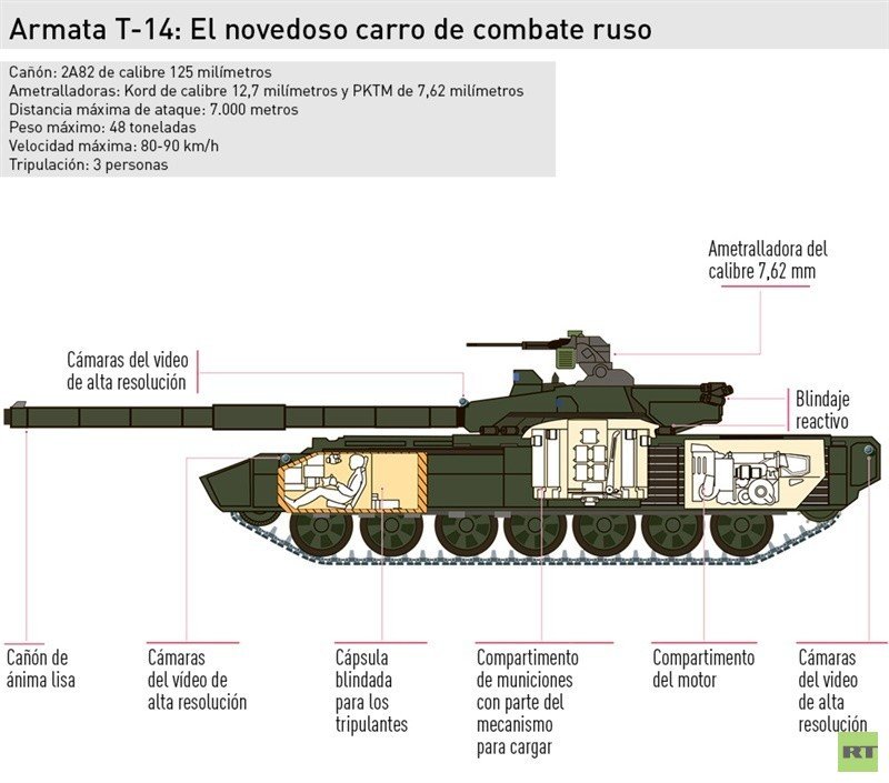 Los carros de combate construidos sobre la plataforma Armata, del modelo T-14, reciben un cañón de ánima lisa de 125 milímetros que dispara el proyectil con una velocidad inicial de 1.900 metros por segundo. Su fuego perfora la cáscara blindaje de más de un metro de espesor a una distancia de 2 kilómetros.