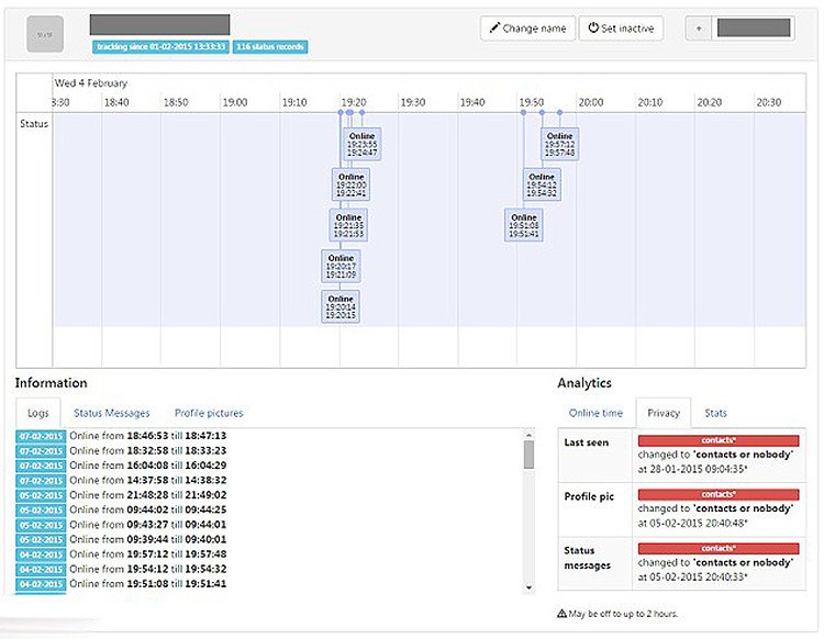 De ese modo, el programa puede mostrar el historial de los cambios de la foto de perfil, mensajes de estado, opciones de privacidad y estado conectado/no conectado. La herramienta muestra una línea de tiempo donde se reflejan todos los cambios del usuario y un registro de todo lo que ha hecho dentro de la aplicación de mensajería.