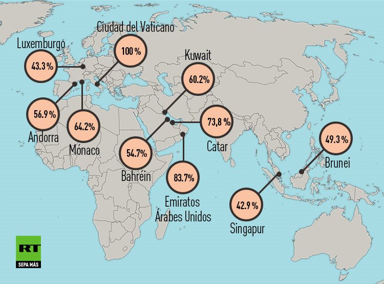 De todos los habitantes de la Santa Sede ninguno ha nacido allí, lo que convierte al Vaticano en el país con mayor presencia proporcional de inmigrantes. Los Emiratos Árabes Unidos y Catar son los Estados del Golfo que más explotan la mano de obra barata de trabajadores que vienen de países como Bangladesh, India y Filipinas.