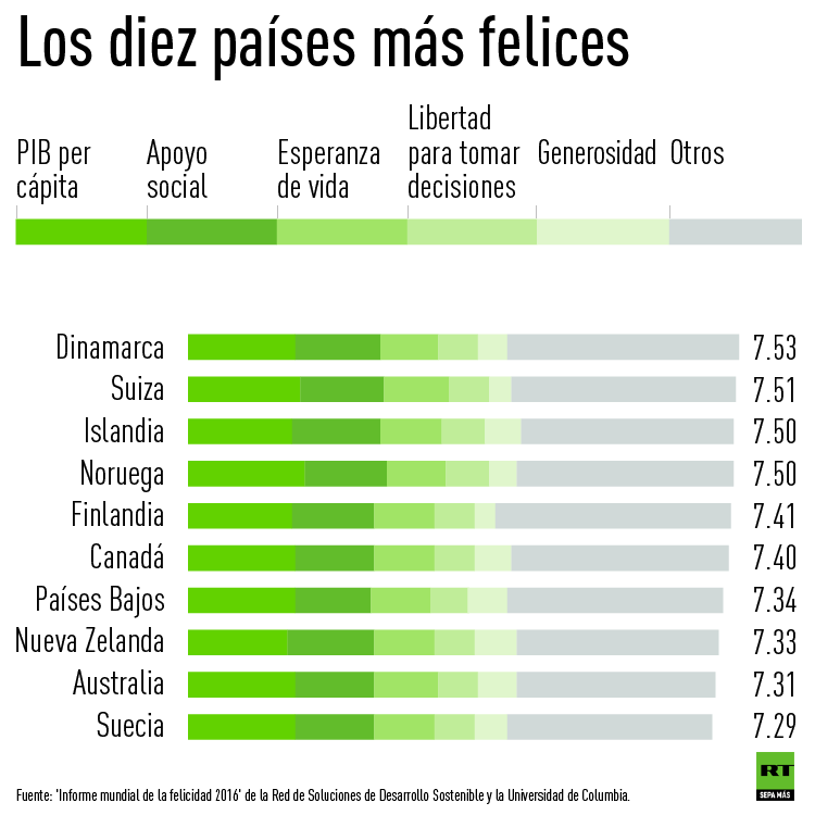 El Informe mundial de la felicidad 2016, elaborado por la Red de Soluciones de Desarrollo Sostenible (SDSN, por sus siglas en inglés) y la Universidad de Columbia (Nueva York, Estados Unidos), ha determinado que Dinamarca es el país más feliz del mundo, con una nota de 7,53 sobre 10, informa Reuters.