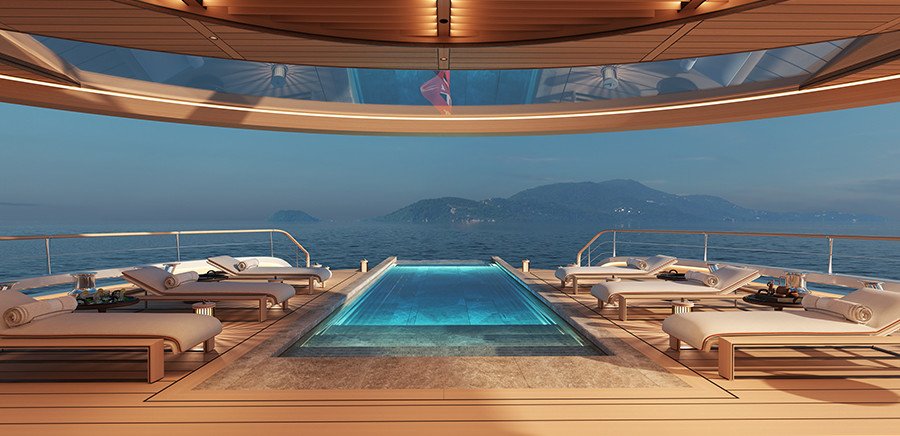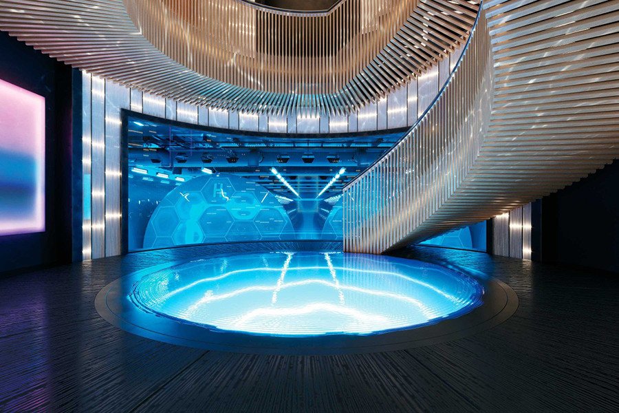 Además de su novedosa fuente de combustible, la compañía ha puesto un considerable esfuerzo en crear un ambiente de conexión en las diferentes áreas. Para ello, el yate cuenta con un mirador de vidrio en la proa y una escalera de grandes dimensiones alrededor de una fuente de agua.