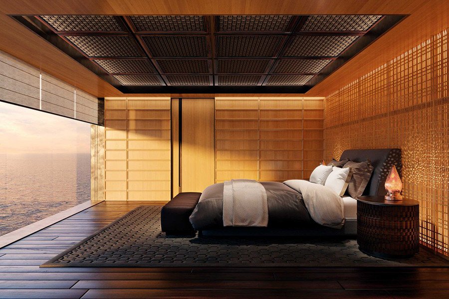 En la parte trasera presenta dos áreas de entretenimiento, con una piscina y tumbonas. Las habitaciones estarán equipadas con un sistema inteligente de control de consumo de energía.