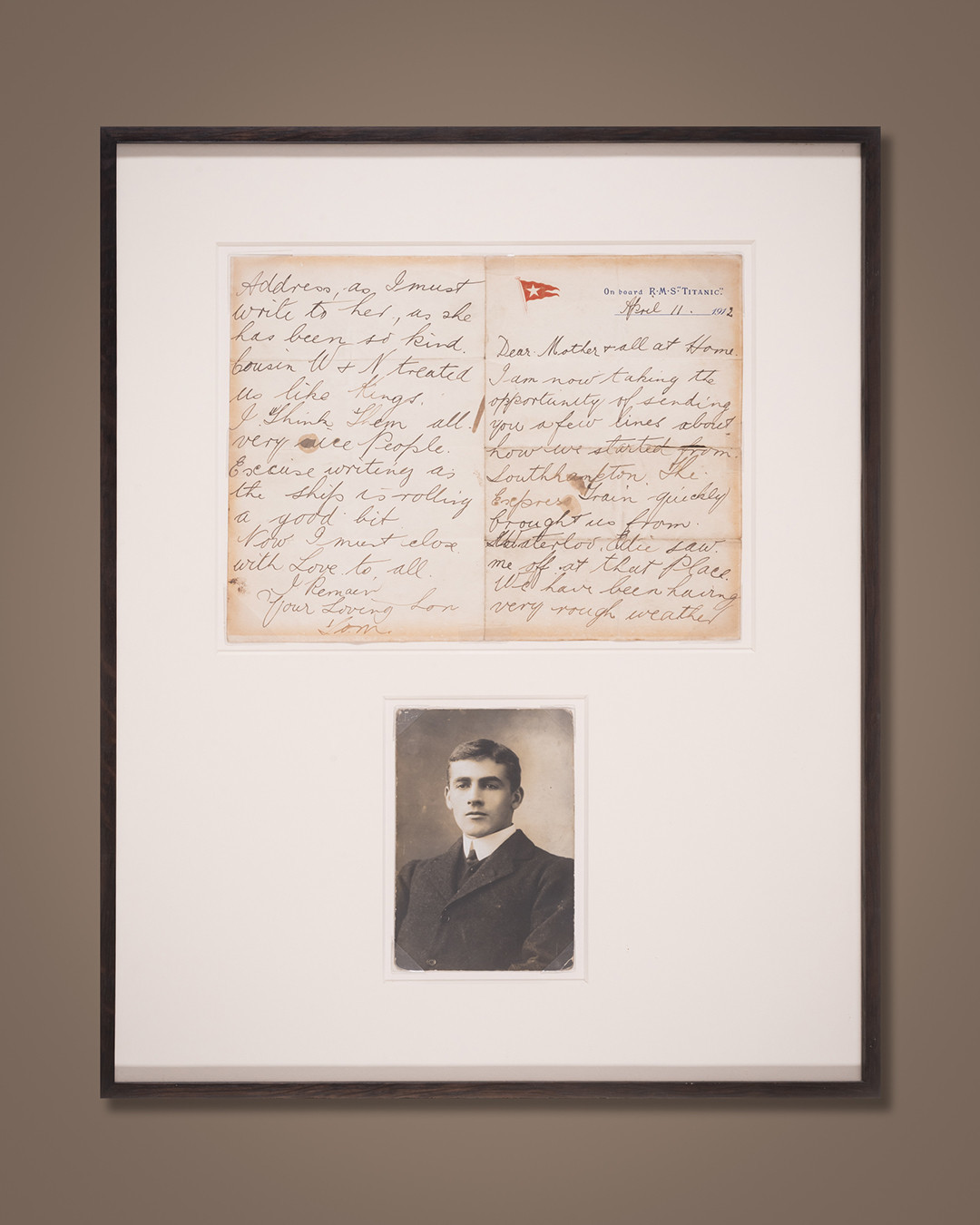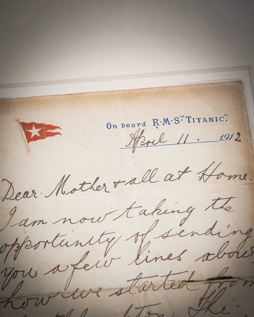 "Querida madre y todos los que están en casa: Aprovecho para escribirles unas líneas sobre cómo partimos de Southampton […] Hemos tenido un tiempo muy duro, pero el barco está tan estable que apenas se notaría su movimiento de no ser por el rugido de los motores. Ahora nos estamos acercando a Queenstown [Irlanda]", reza la carta, enviada precisamente desde ese puerto irlandés (ahora llamado Cobh) que fue la última escala del Titanic antes de partir rumbo a Nueva York.